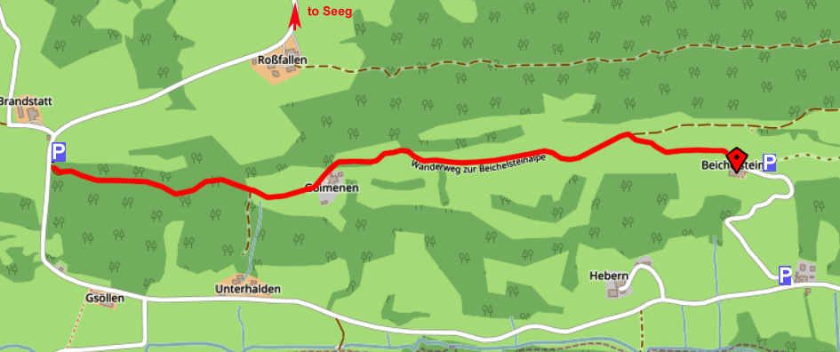 Better drive first by car to the village "Seeg" (google maps) and then continue to one of the parking lots in the map.