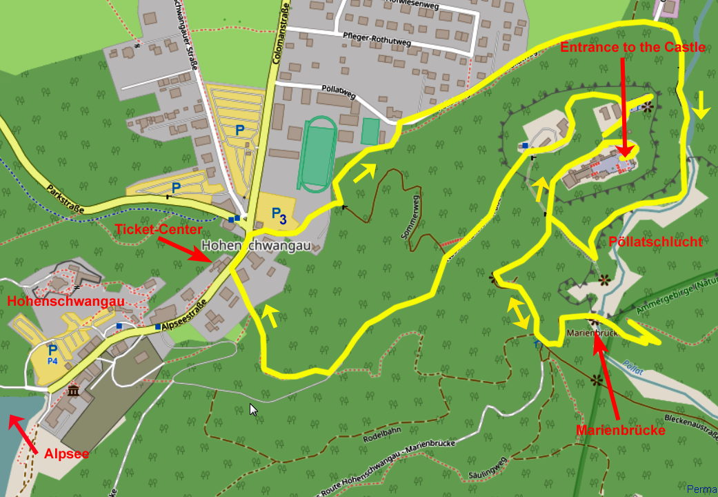 Gorge PöllatschluchtFor the ascent to the castle you can also go through the "Pöllatschlucht", a gorge with waterfalls, but I would plan a ¾ hour for it or use the gorge for the way back. The gorge is sometimes closed for safety reasons. Please ask at the ticket centre.see map Address: Hohenschwangau, Pöllatschlucht (google maps) |