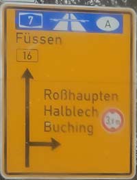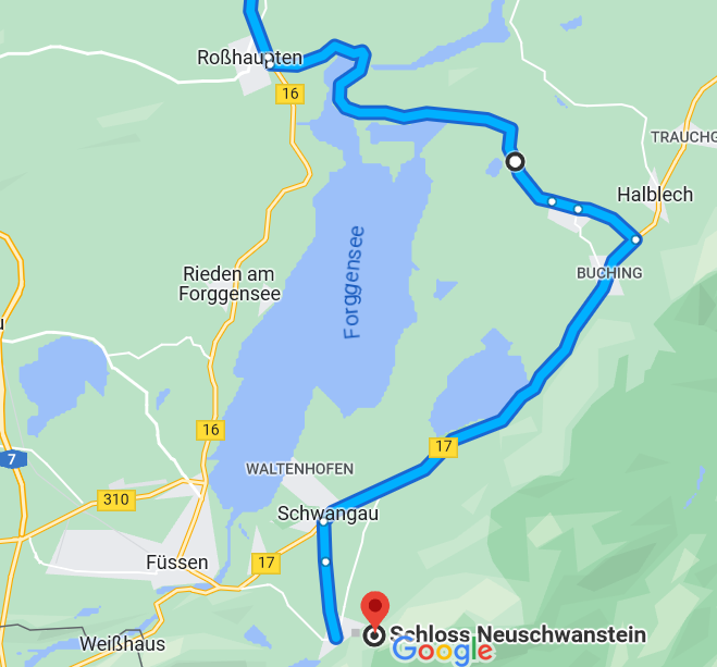 To use the nicer route, go as far as Roßhaupten at the beginning of Lake "Forggensee".